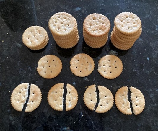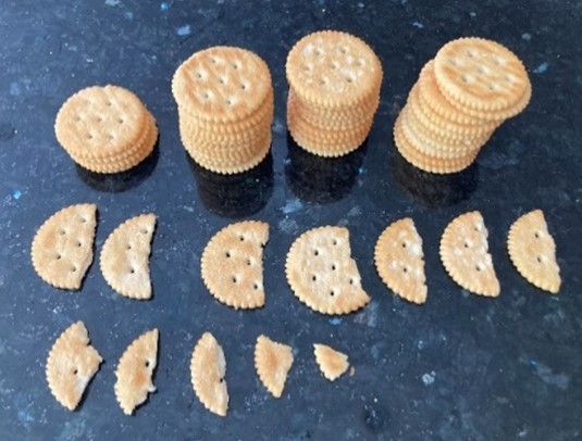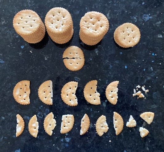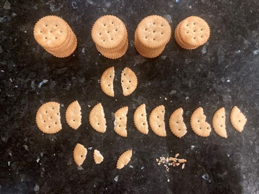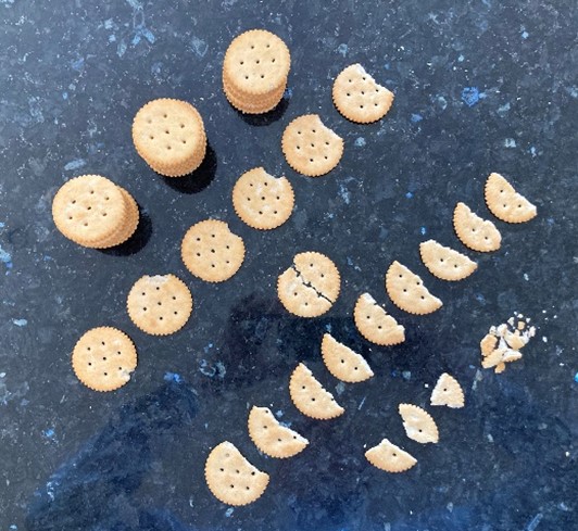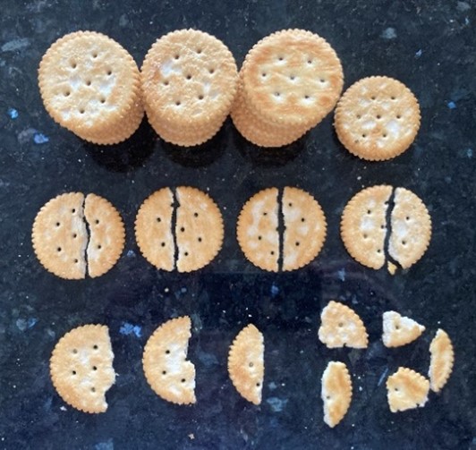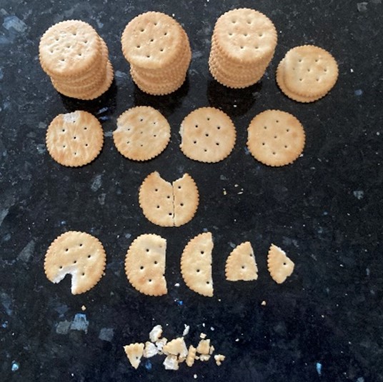 All 10 boxes that I analysed contained multiple broken pieces, but in only one of the 10 boxes (No. 8 in the table above) was it possible to match up all the parts to form whole crackers – or even nearly-whole, allowing for gaps to be filled by the small crumbs. The most startling example is No. 10 in the table: 39 whole crackers, plus two large pieces that do not fit together. No. 4 is similar.